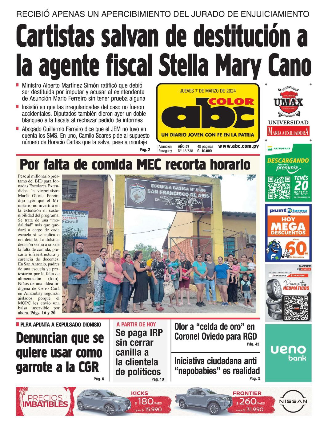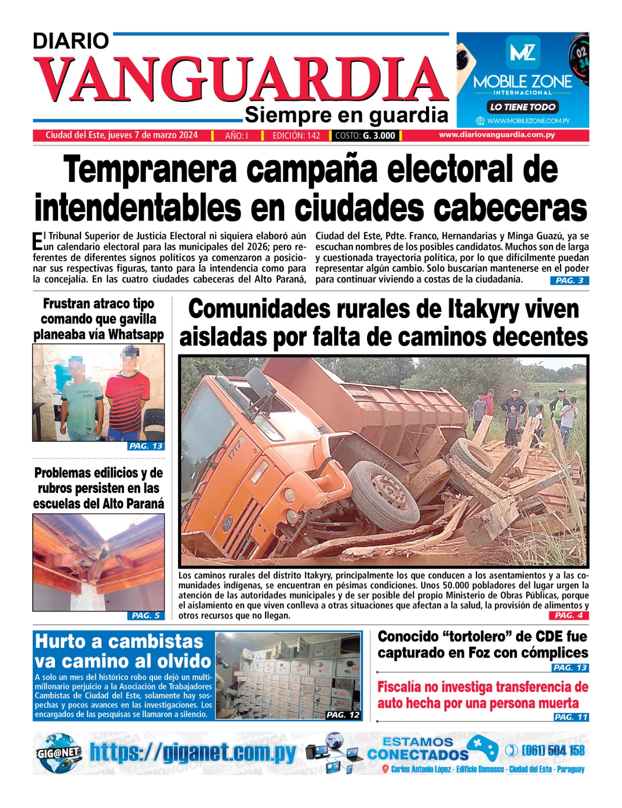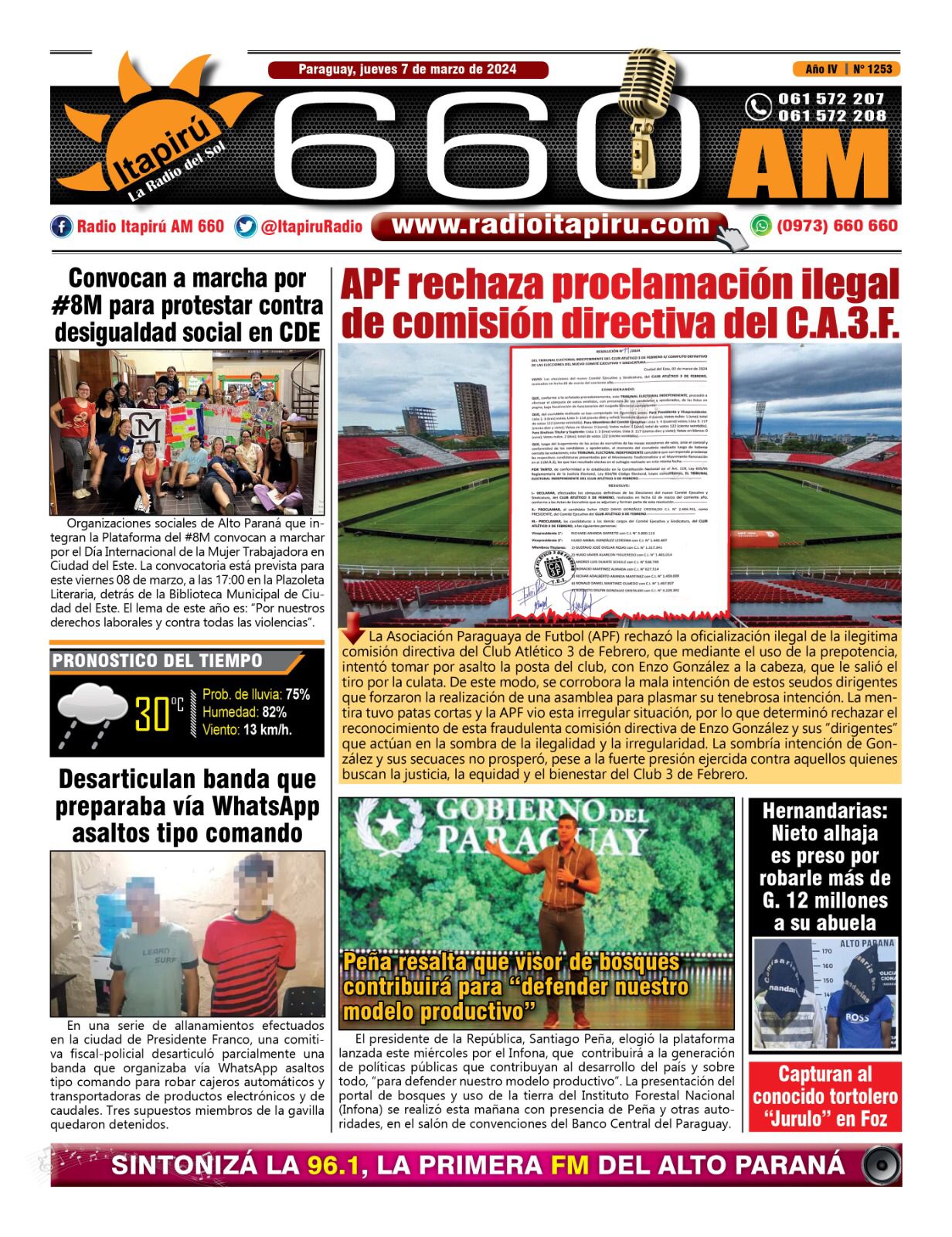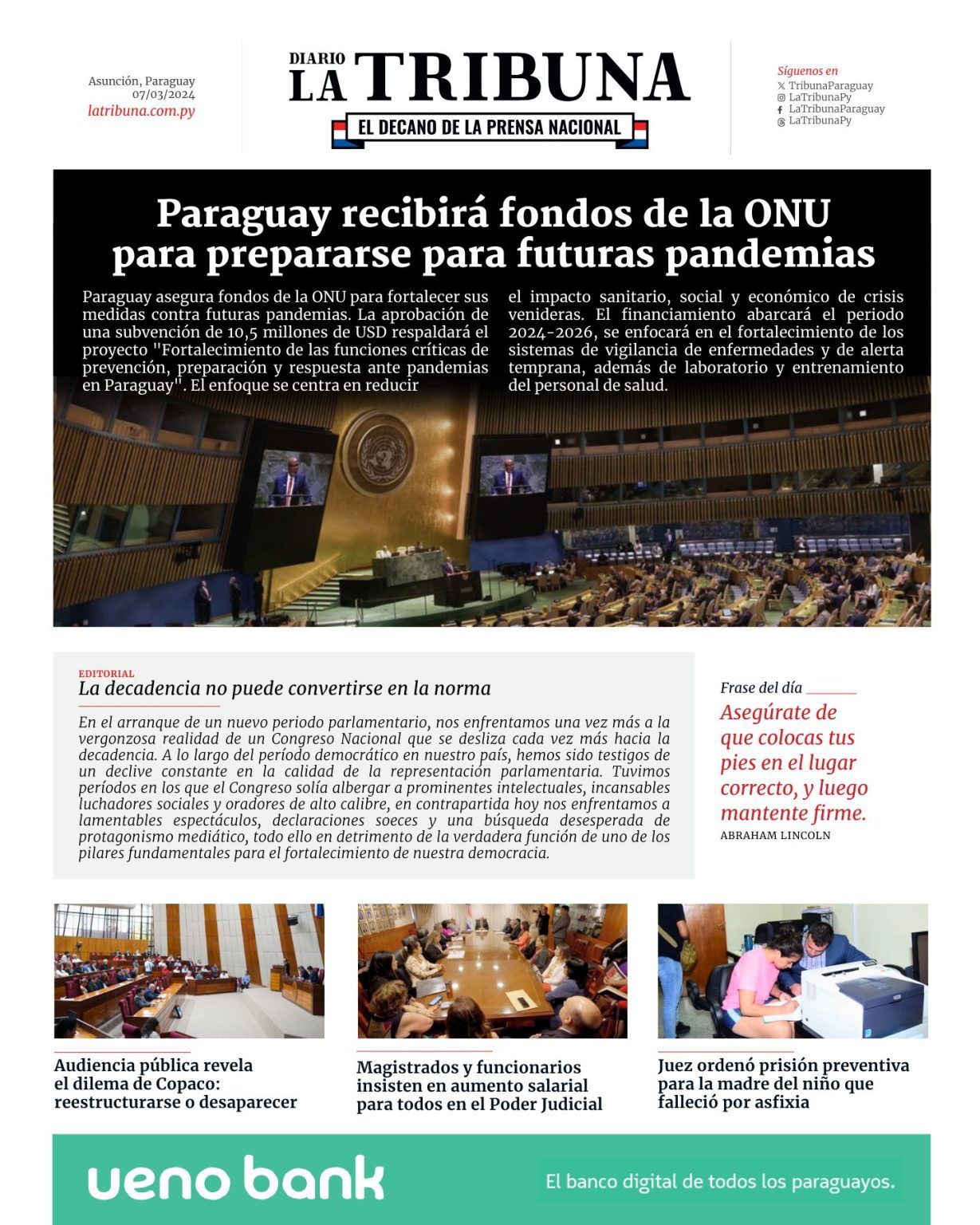 TitularesTitulares 7 de marzo 2024 Last updated: marzo 7, 2024 06:03 Oñondive Share 0 Min Read SHARE Titulares 16 de abril 2023 Titulares 28 de julio 2023 Titulares 18 de febrero 2024 Titulares 23 de junio 2023 Titulares 19 de setiembre 2023Suscríbase al Boletín¡Manténgase al día! Reciba las últimas noticias de última hora directamente en su bandeja de entrada.[mc4wp_form]Al registrarse, acepta nuestras Condiciones de uso y reconoce las prácticas de datos en nuestra Política de privacidad. Puedes darte de baja en cualquier momento. Share This Article Facebook Whatsapp Whatsapp Copy Link Print Share Previous Article Titulares 6 de marzo 2024 Next Article Titulares 8 de marzo 2024 No hay comentarios No hay comentarios Deja una respuesta Cancelar la respuestaTu dirección de correo electrónico no será publicada. Los campos obligatorios están marcados con *Comentario *Nombre * Correo electrónico * Web Guarda mi nombre, correo electrónico y web en este navegador para la próxima vez que comente. Δ SíguenosEncuéntrenos en las Redes SocialesFacebookLikeXFollowInstagramFollowYoutubeSubscribeNoticias Destacadas Titulares Titulares 29 de mayo 2024 Oñondive mayo 29, 2024 Titulares 9 de abril 2024 Titulares 8 de marzo 2024 Titulares 7 de marzo 2024 Titulares 6 de marzo 2024- Advertisement -